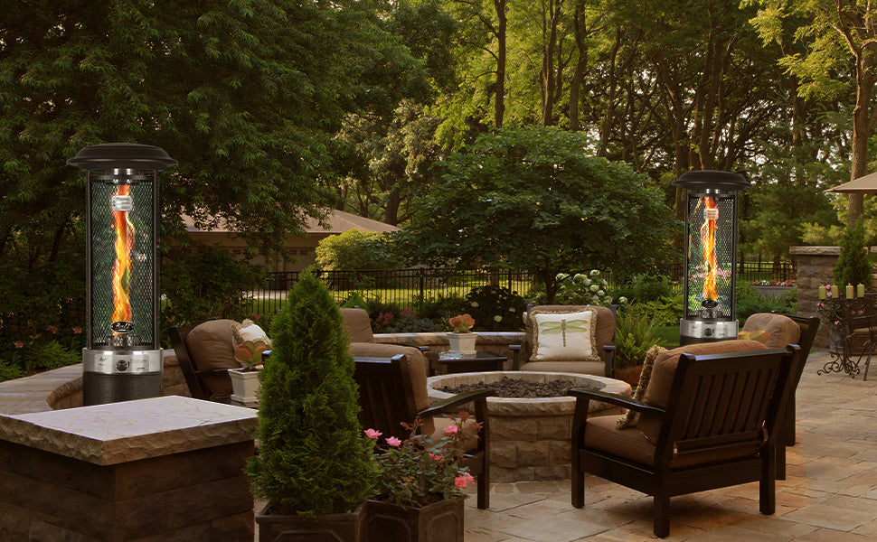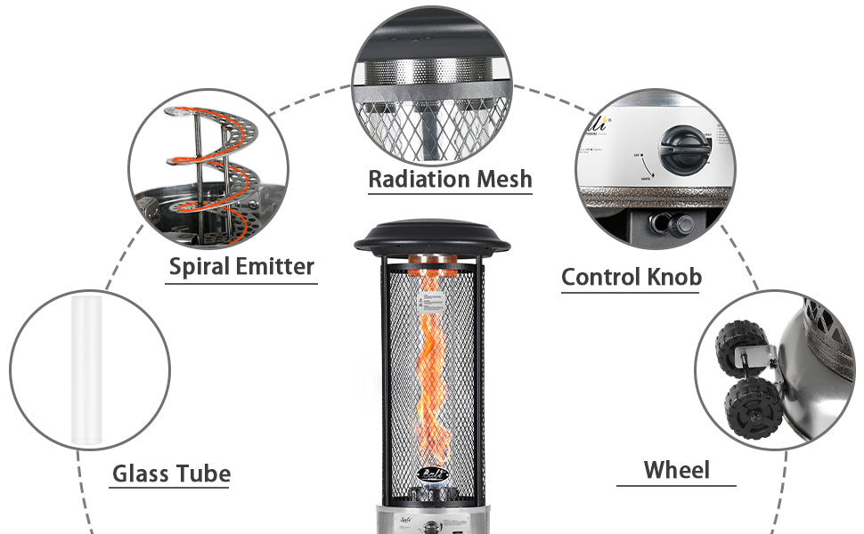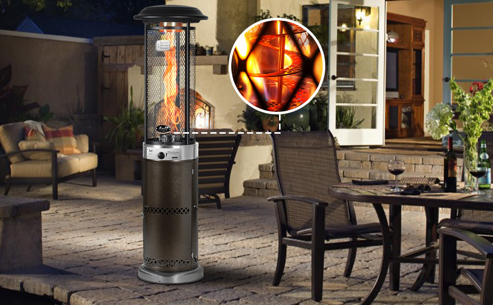 - Graceful Flame: The height of bali outdoor patio heater was 71.2 in, use a glass tube to make the flame transfer heat stably, spiral design bring round dancing flame and save energy, while enjoying the warmth, it can also decorate your backyard