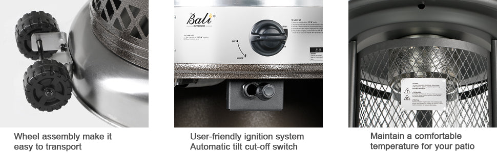 - Tip-Over Protection System: Bali outdoor patio heater built with an automatic safety tip-over valve that shuts the propane off in the event the heater is ever knocked down, use 20lb gas tank(not include), with big and stainless steel base help you easy to install the gas tank