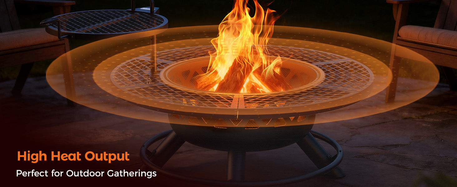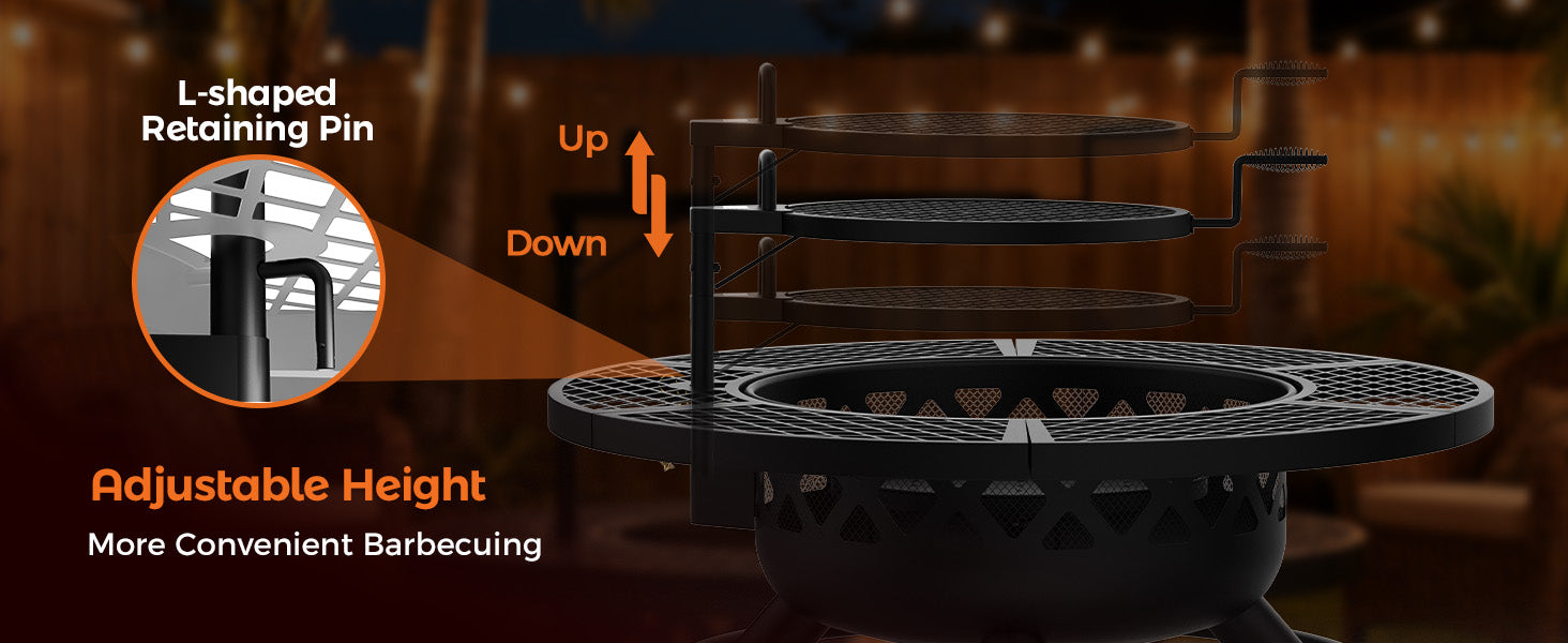 - đ„Safe and Reliable: With built-in handles, the outdoor fire pit with grill can be easily rotated 360 degrees and adjusted up and down in height. And the stable round support structure makes wood burning fire pit safer to use. It provides a safe experience