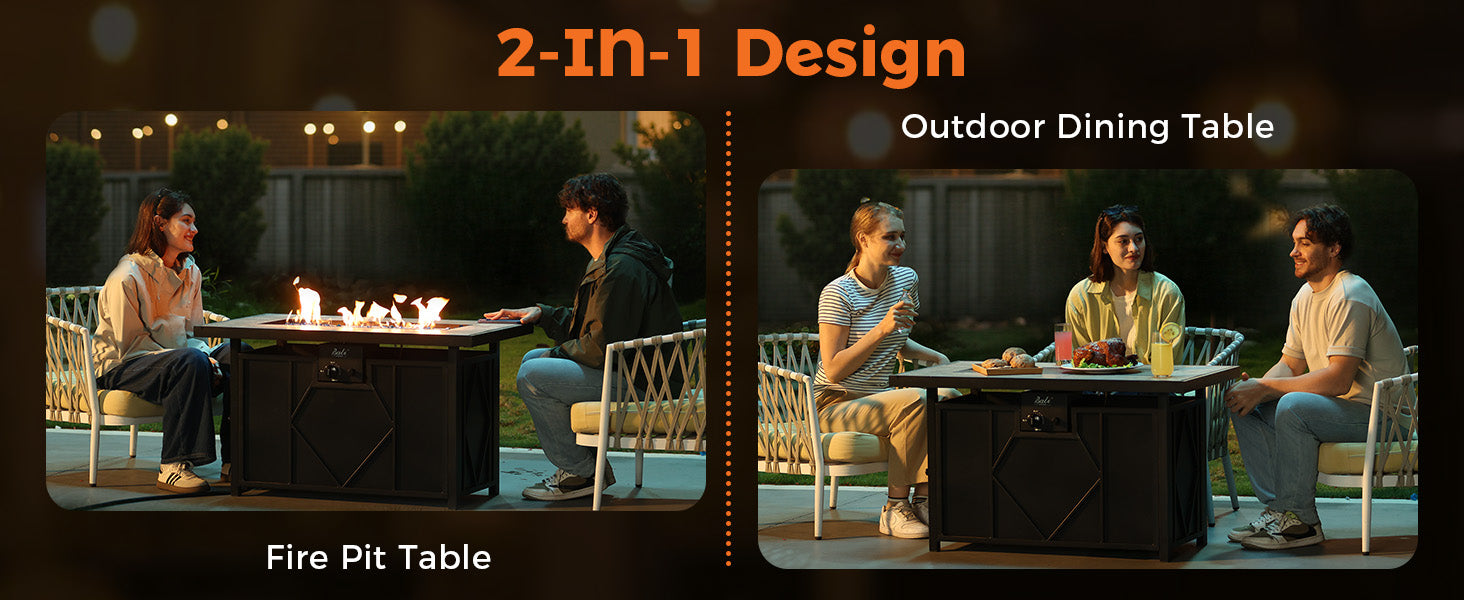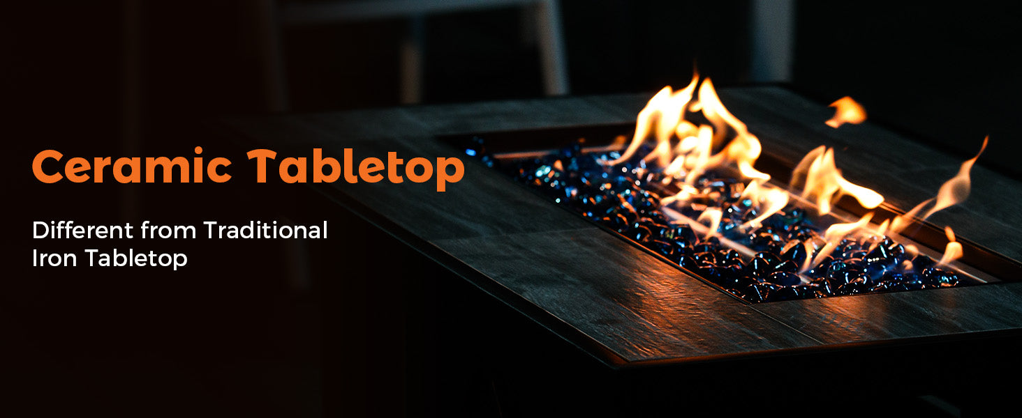 2-in-1 FireTable Design: This gas fire pit with cover lid combines the warmth of a traditional firepit with the practicality and convenience of the table, beautiful real ceramic tabletop with steel stamped wicker base creates additional decoration in any living place