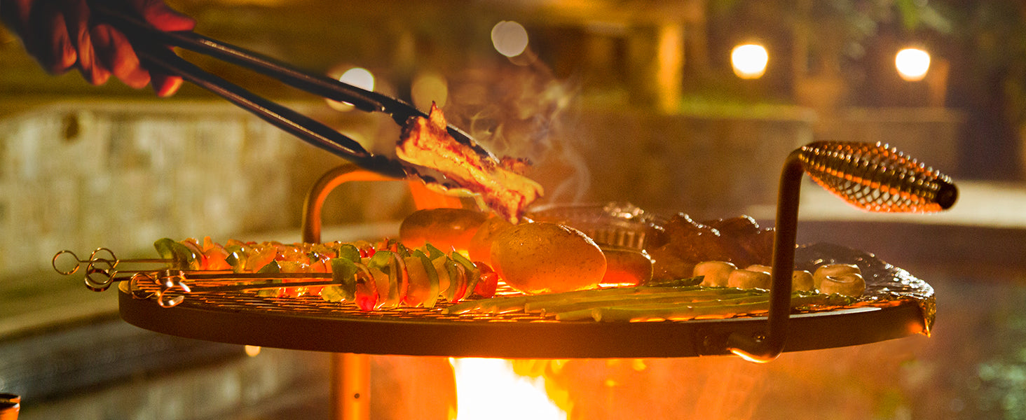 - Safe and Reliable: With built-in handles, the outdoor fire pit with grill can be easily rotated 360 degrees and adjusted up and down in height. And the stable round support structure makes wood burning fire pit safer to use. It provides a safe experience