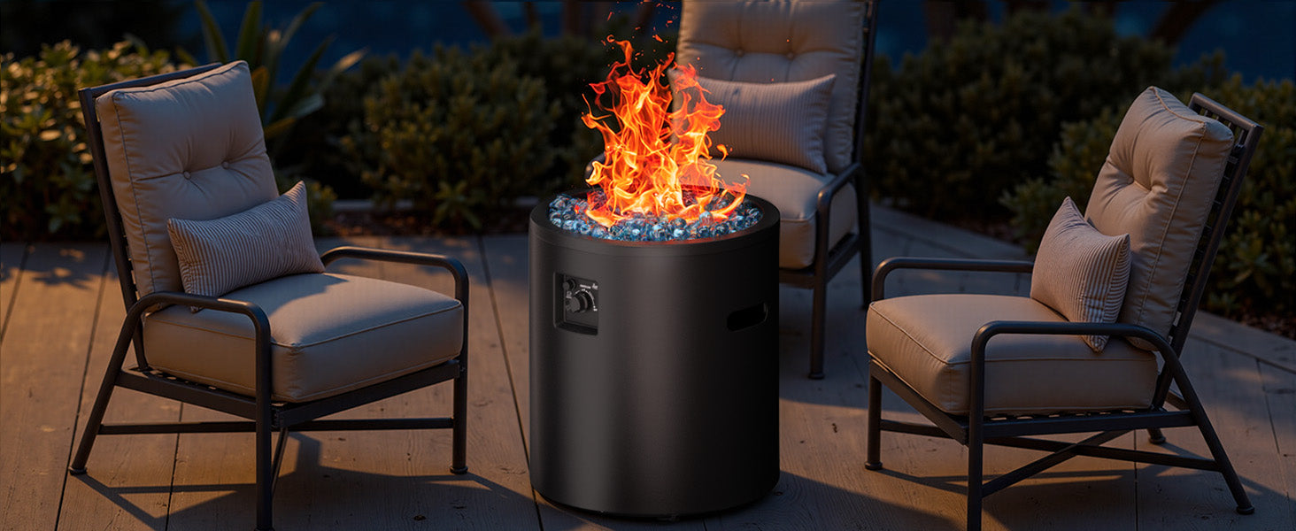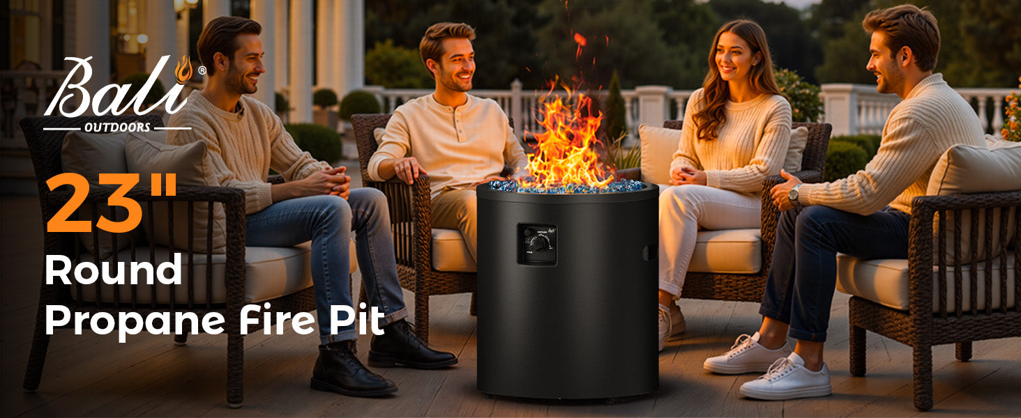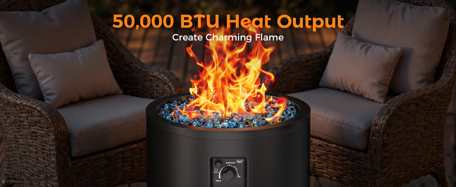 - Warm Atmosphere ♡ 50, 000 BTU heat output from propane round fire pit, can freely adjust the flame size. Let the dancing flame to light up the dulcet night. This cylinder fire pit is perfect for your patio, porch and backyard.