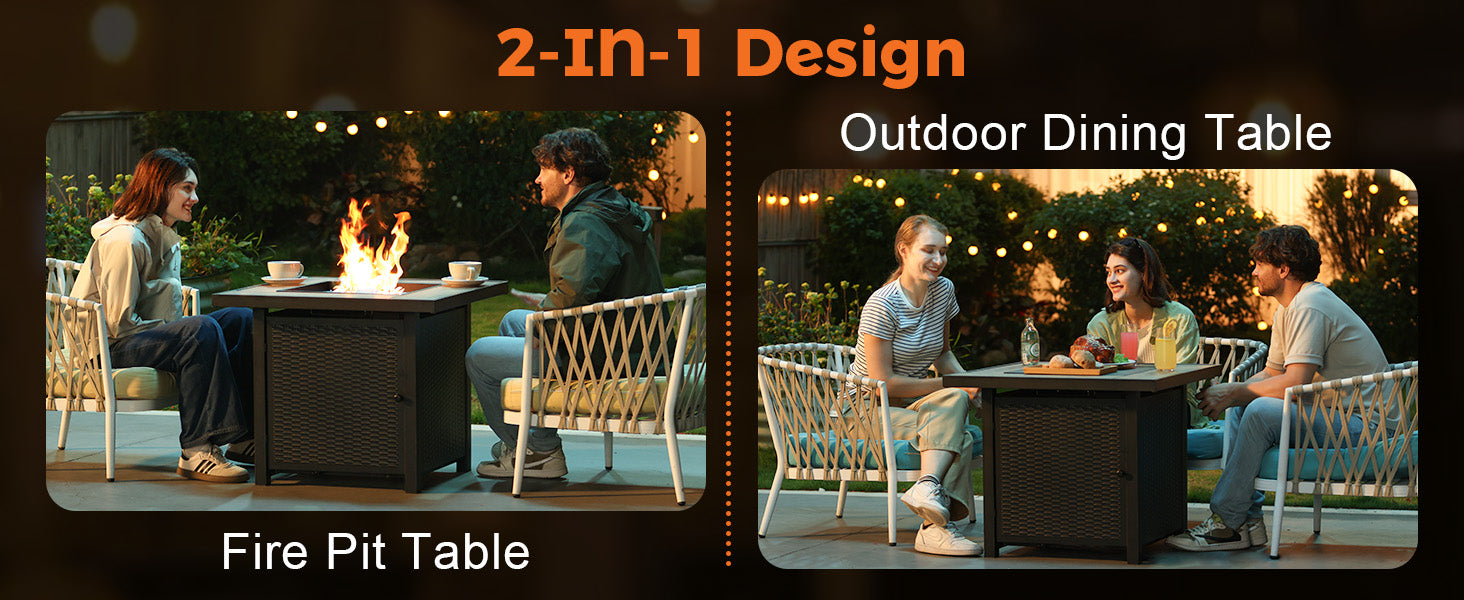 2-in-1 Design: Patio fire pit is a stylish and practical table to use as you dine and eat. When you want to enjoy a relaxing fire, remove the cover on the firepits for outside to see it, which creates a cozy atmosphere