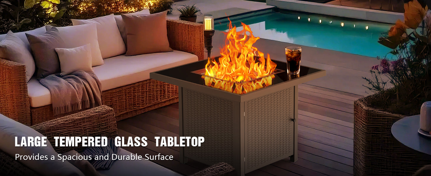 - Glass Tabletop: Propane fire pit features a large tempered glass tabletop, which has a strong and durable surface. The sleek surface can completely reflect the dancing flames in fire pit table, creating a mesmerizing visual effect