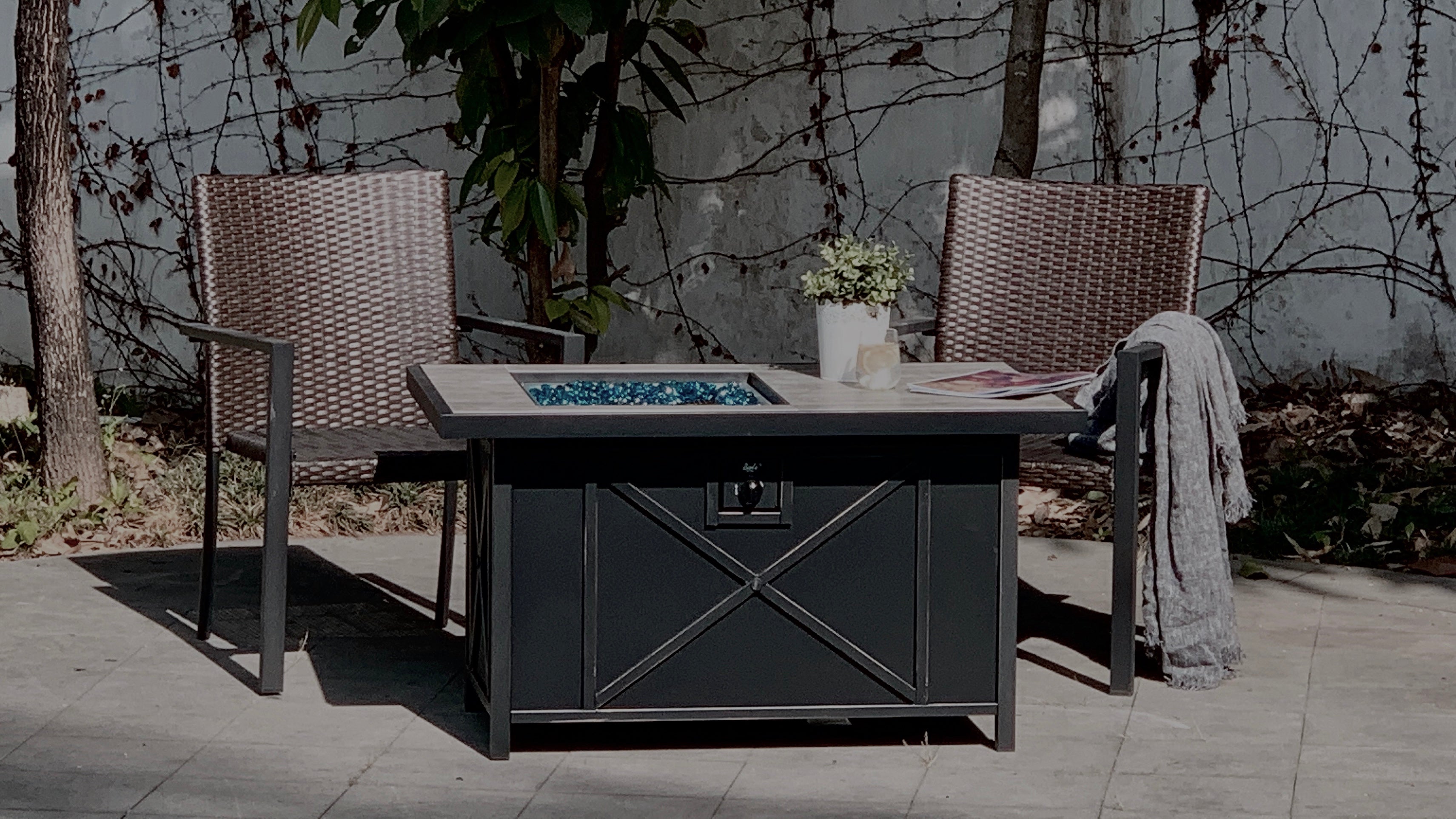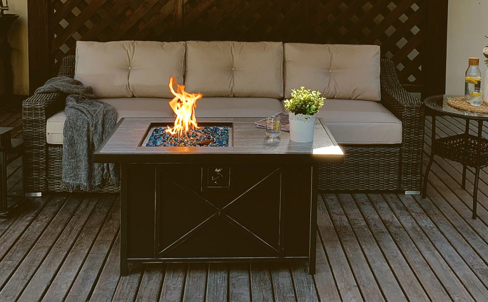 - Blue Smooth Fire Smooth Fire Glass – This gas fire pit table comes with 15lb decorative fire glass which makes your fire pit more beautiful when burning; you never need to buy the glass separately. Fashion appearance corresponds to your garden, courtyard, terrace, balcony