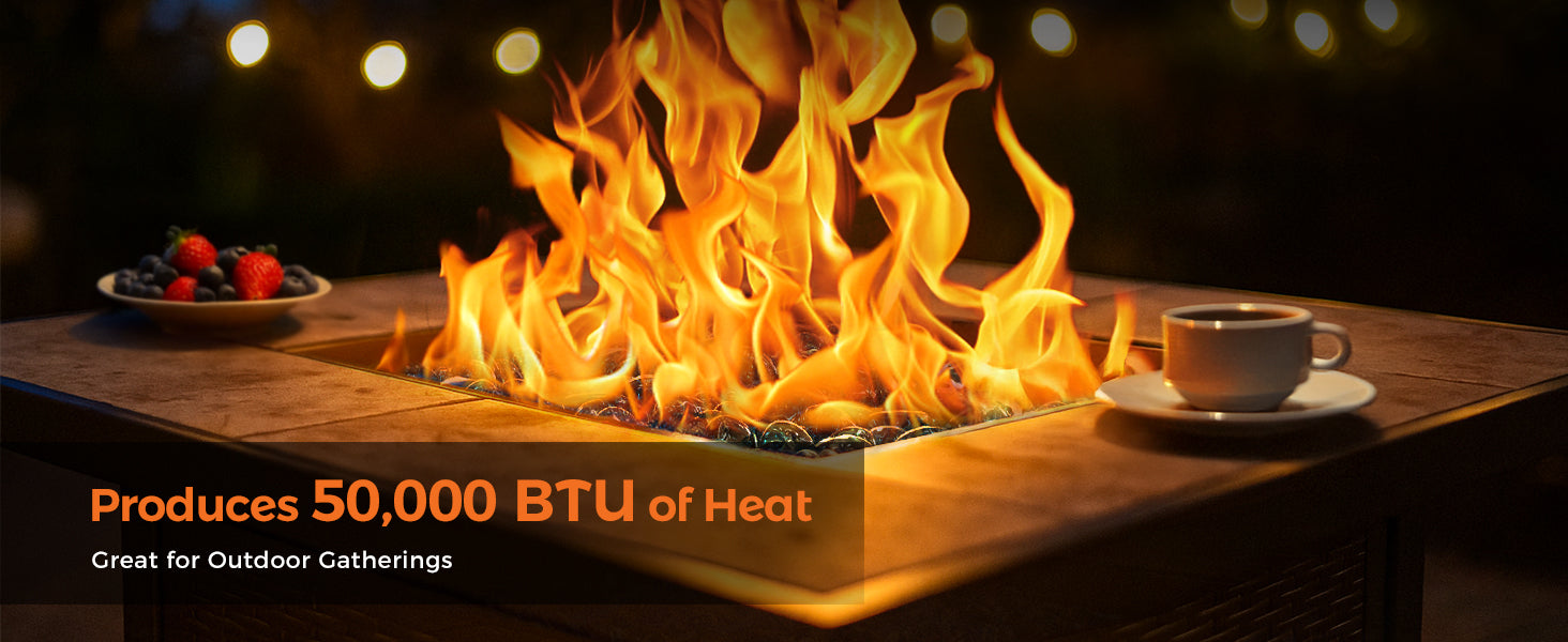 - Glass Stones Gas Firepit Table - 50,000 BTU stainless steel burner Gas Fire Pit Table with advanced glass stones bring the beautiful flames, a warm atmosphere for your family and friends to reunite
