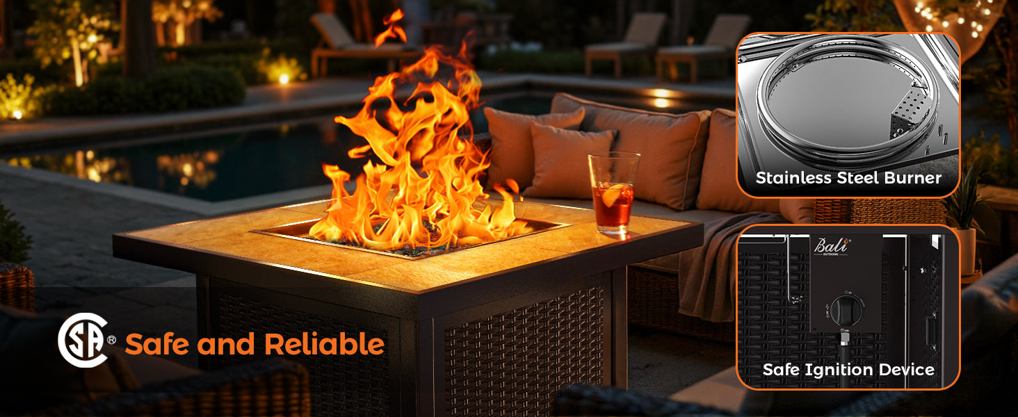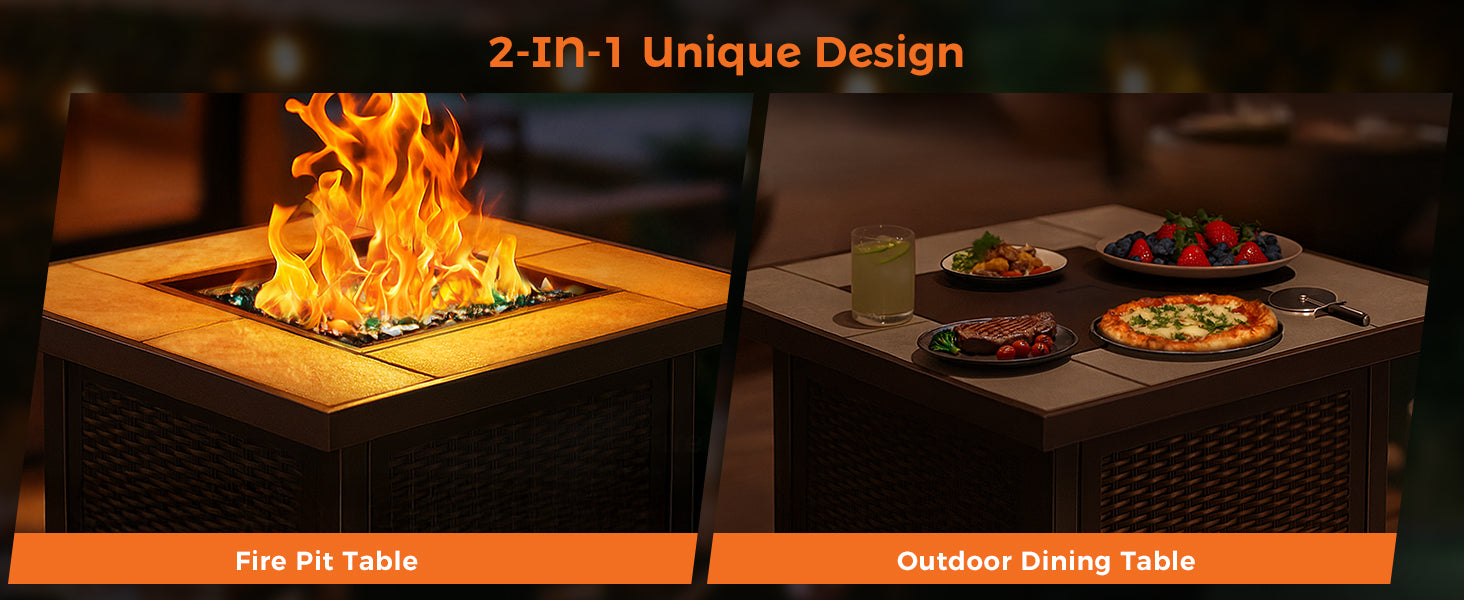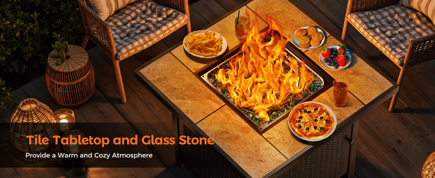 - Convenience Featires - Our gas fire pit table comes with 6 pcs independly table tiles and 15 lbs Ice decorative glass rock set, you can change the color of the tiles anytime when you want